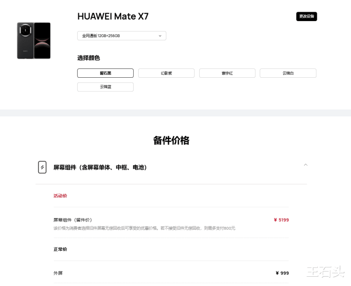 根据华为官网公布的备件价格,华为Mate X7最核心、也最脆弱的部件,就是屏幕组件,包含屏幕单体、中框和电池,其“留件价”为5199元。